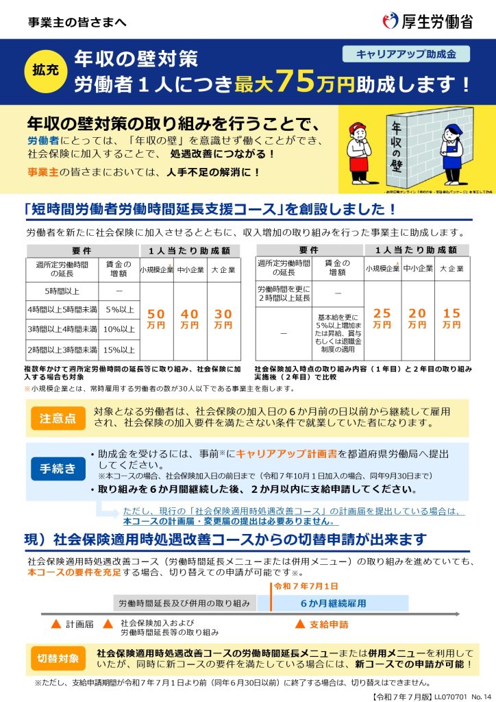令和7年7月から、「年収の壁」で働く時間を控えている人を支援するために、キャリアアップ助成金に新しいコースが追加されました。